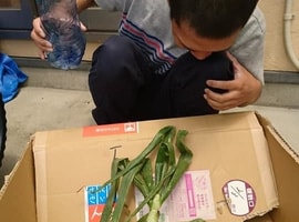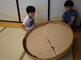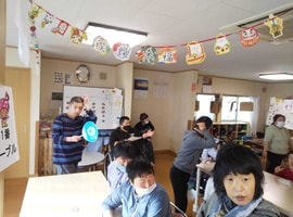 片平農園で収穫した「みんないっしょ」のジャガイモと玉ねぎの詰め放題と、宙の仲間たちのインゲン等、採れたての野菜をお譲りしました。その他にも、本宮にあるKファーム「こころ食堂」さん手作りの“小豆ザーザー(段ボールと小豆で波の音を再現)”もお借りして、遊びコーナーに置かせて頂き、楽しんで頂きました。