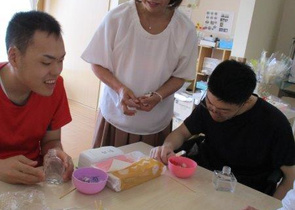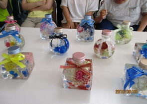 郡山市授産センター講師派遣事業で、講師の波多野先生にお越し頂き、アロマディフューザー作りを行いました。前回は、ハーバリウムボールペンを作り、父の日のプレゼントやお世話になった方へお礼としての発注を頂くことができました。今回のアロマディフューザーは、ハーバリウムとしても飾ることが出来ます。メンバーの皆さんは、棚の上に飾られているディフューザーを手に取っていました。