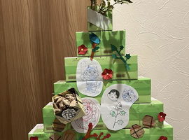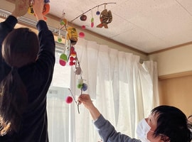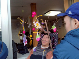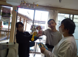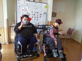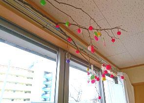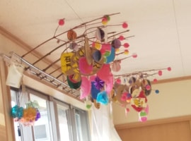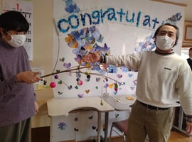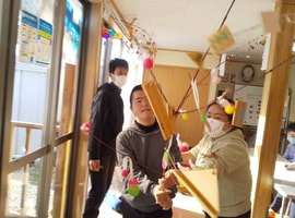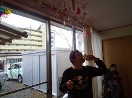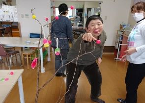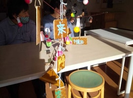 「笑門来福」「笑福」などの文字も書いて飾られまし鯛。昼食はすいとん汁をみんなで作り食べました。午後には誕生月の方の好きな曲を、さとさとみさんの「びっくりりんご」には、皆さん集まりました🎶ロックやクラっシックも🎵