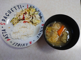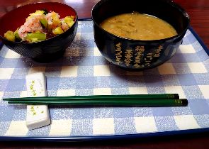 をとりちぎり、炊きこみワカメと混ぜた梅しそご飯の上にわさび漬けをちりばめて味わいました。食物繊維入りのすいとんと梅しそご飯が人気でした。