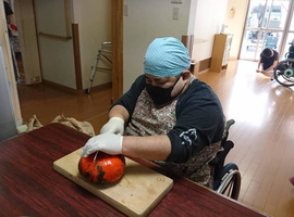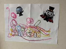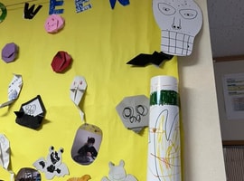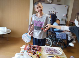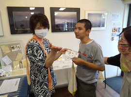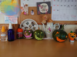 御家族と自律地域共生生活を目指すチームから、赤い羽根共同募金に寄付があり、届けさせて頂きました。自律チームは、上半期畑活動での収益からお疲れ様の報酬が渡されて、その一部を募金してくださいました。ハロウィーンなので室内装飾とハロウィーンバージョンターメリックライスカレー を♪ハロウィーンについてネットで調べて学び、頂いたお菓子を詰めて持ち帰りました。なかま展に出展した一閑張りを、エンゼル菓子店さんに展示販売して頂いており自信に繋がってます。