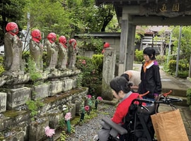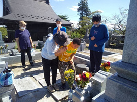 みんなで作った色とりどりの花が下がった室内、ダウン症についてのお話しの後、メンバーさんもなるべく早く地域生活を楽しんだ方が良いとの先生のお薦めにて、風になられたメンバーさんのお墓参りに皆んなで行きました🌸