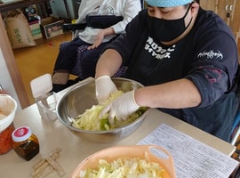 はやとうりをサービスしてくださった西田町の「ほんだ屋」さんに塩麹浸けしたものを味見でお届けしました。そして、支援学校の実習生の為に、手作りキムチの仕込みをピアスタッフメンバーさんが頑張ってくださいました。賑やかさが苦手な実習生が不安無くトライできるように、日和田の畑様子見から、Kふぁーむさんに昨日予約しての卵購入に外出。自律料理チームは、休みがでて、チヂミ作りへとメンバー不足のなかピンチヒッターになり、将来ある後輩に社会人対応?をお見せ出来ました。