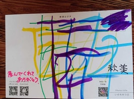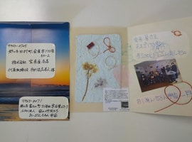 本田一浩さんからプレゼントして頂いたカードにメンバーさんが、選んだマジックで思いの色を描き、言葉はメンバーリーダーが考えて記入して下さいました。BGMは、さとさとみさんの「 いのちのつぶ」流して、本田さんとのコラボのCDで、さとみさんのお嬢さんが存命であれば20歳。おーぷんさろん宇宙と同い年。産んで頂いて 出逢えた 今 に感謝(^人^)です。