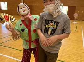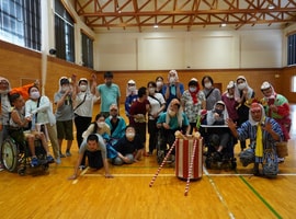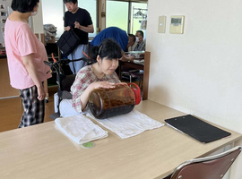 食事後、空き缶で作ったカンカラ三線の音色が聞こえると「何が始まる?」といった様子で皆さんソワソワ。コンサートがスタートすると、皆さんノリノリ。身体で表現する方、とても穏やかに聴かれる方、積極的に観やすい所に移動して笑顔で聴かれる方等、普段見られない表情にスタッフも驚き、どんどんリクエストして心も身体も弾んだ時間でした。