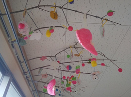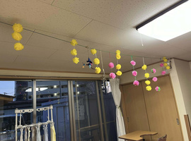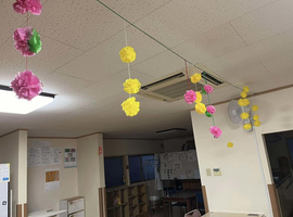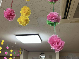 上巳の節句のピンクと緑、ダウン症啓発デーの黄色、自閉症啓発デーの青、のお花紙をレイ(花かざり)にして自宅へ持ち帰りました(*^^*)✨