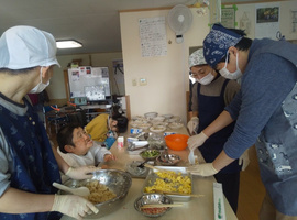水害から一年。見事に復活された地域活動センターげんきさんにご挨拶に行き、頂いたカラフル小麦粉ですいとん作り、ご飯は三穂田の西光寺さんから頂いた新米で、皆さんおかわりをしました!